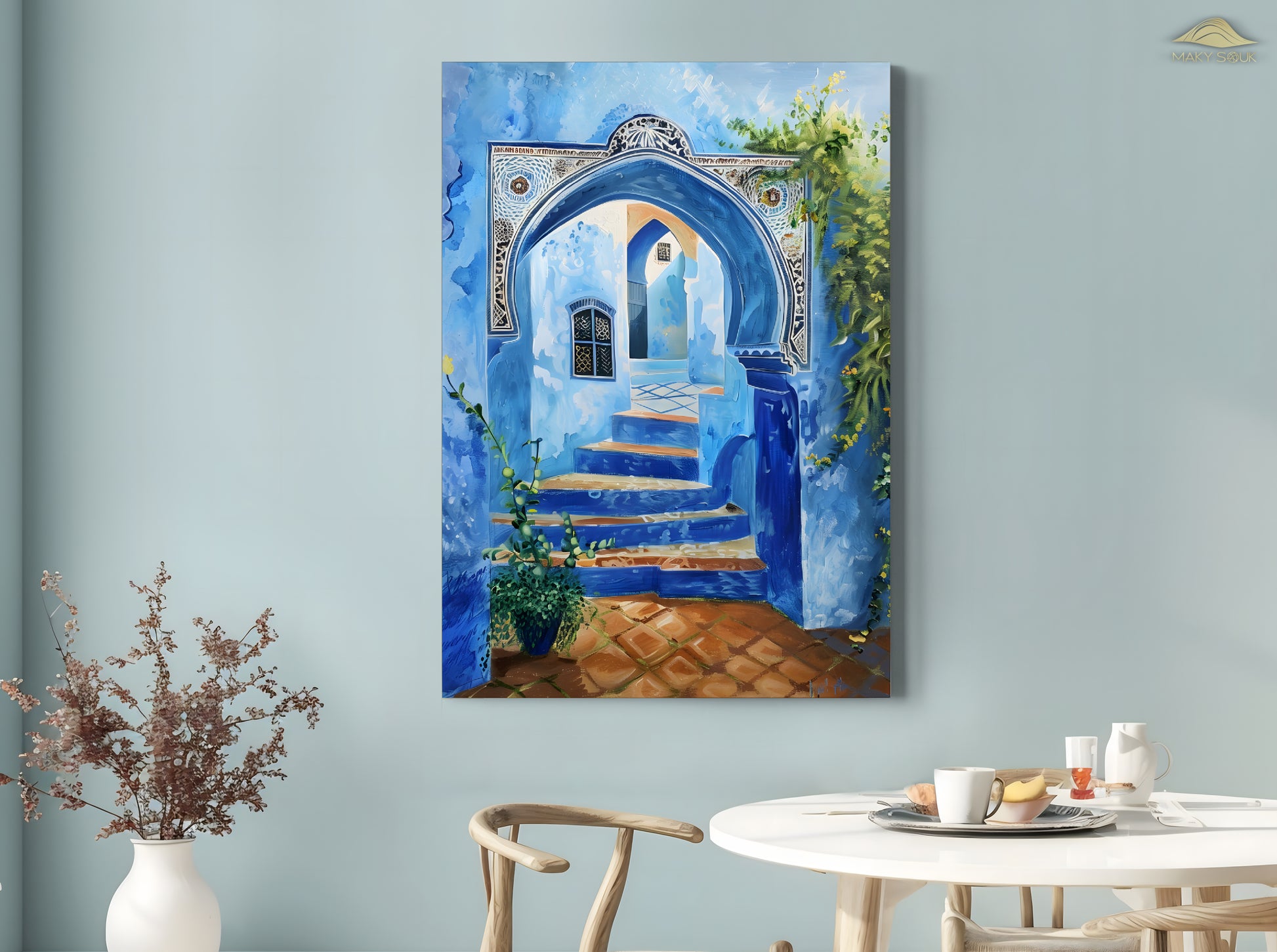 Tauchen Sie ein in die atemberaubende Welt der blauen Stadt Chefchaouen. Dieses Canvas-Motiv fängt die charakteristischen Blautöne und die einzigartige Atmosphäre Marokkos ein und bringt sie direkt in Ihr Zuhause. Der detailreiche Druck betont die Schönheit der traditionellen arabischen Baukunst und schafft ein visuelles Erlebnis, das Ihre Wände zum Leben erweckt.