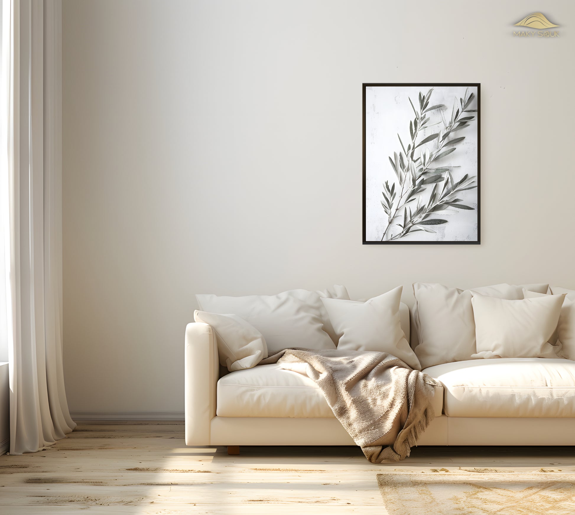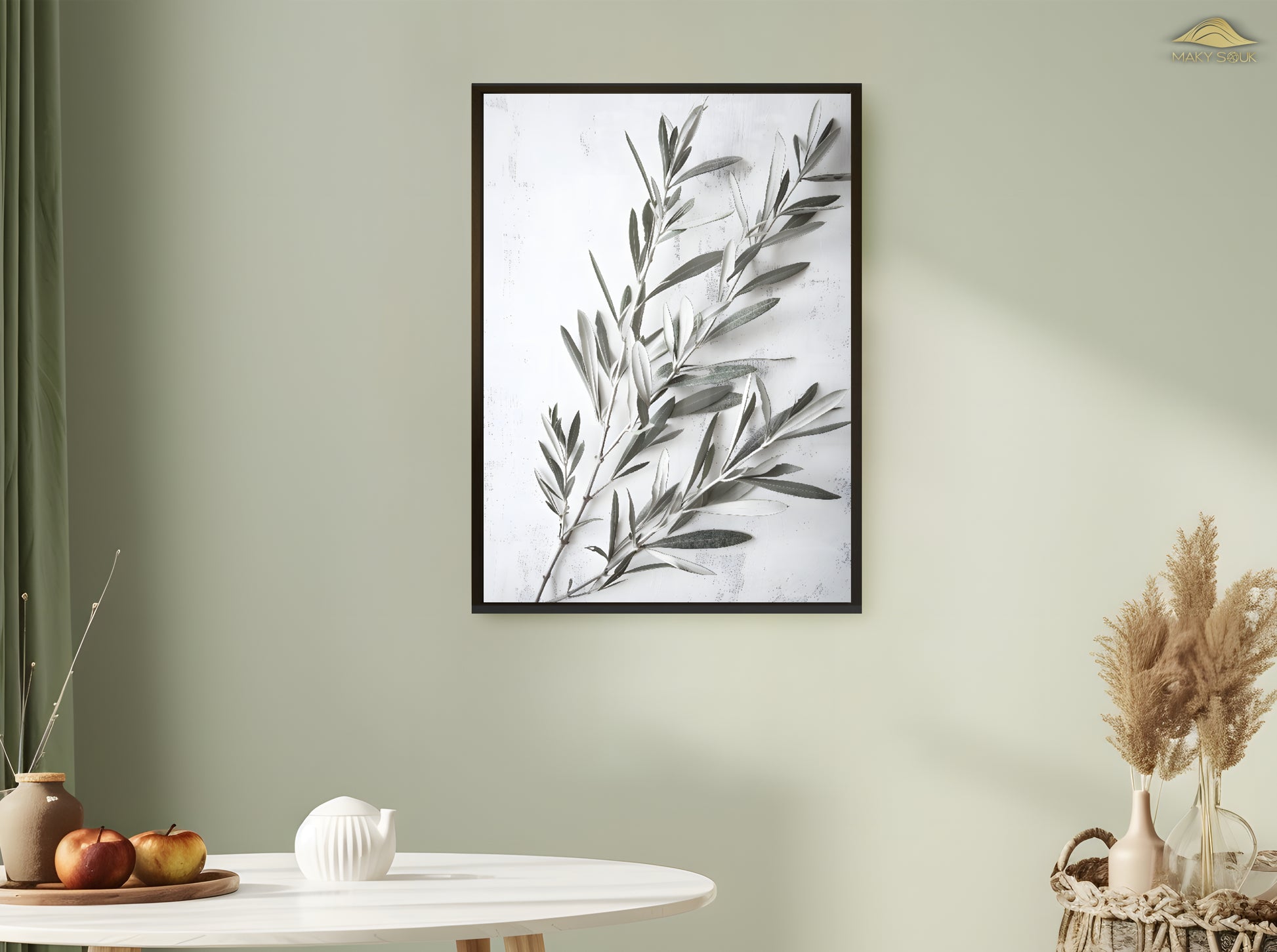 Genießen Sie die elegante Einfachheit eines Olivenzweigs, dieses Poster kombiniert minimalistische Schönheit mit kraftvollen visuellen Effekten, wodurch der Olivenzweig in seiner ganzen Pracht zur Geltung kommt. Der klare Kontrast und die subtile Farbgebung schaffen eine stilvolle Atmosphäre für Ihr Zuhause.